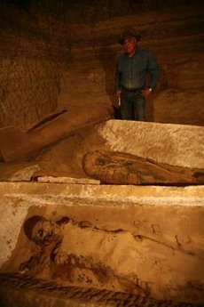 這具包裹在亞麻布內(nèi)的木乃伊發(fā)現(xiàn)于塞加拉地區(qū)著名的階梯金字塔西南一座地下墓室。本月9日,考古學(xué)家在這座墓室內(nèi)發(fā)現(xiàn)22具木乃伊和8座石棺和木棺,其中大部分未置棺內(nèi)的木乃伊因年代久遠(yuǎn),已出現(xiàn)不同程度破損。11日,考古學(xué)家開啟其中的一座石棺,發(fā)掘出這具極品木乃伊。