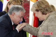 卡欽斯基親吻德國(guó)總理默克爾