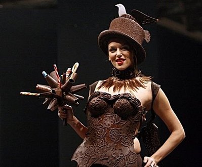除了展示巧克力做成的模型外,沙龍期間,每天下午5點(diǎn)都將舉辦巧克力時(shí)裝秀,模特們身穿用巧克力做成的服裝亮相T臺(tái)。