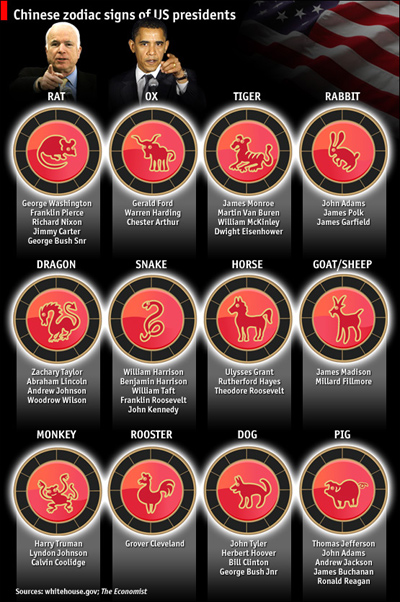 按照中國的12生肖,麥凱恩是屬鼠的。而在他之前有5位屬鼠的候選人最后當(dāng)選總統(tǒng),包括:喬治·華盛頓和吉米·卡特。另外,屬豬和蛇的前總統(tǒng)也達(dá)到5位。然而,屬牛的奧巴馬似乎遇到了不好的兆頭,在他之前,只有3位屬牛的候選人最終問鼎。(弗萊)