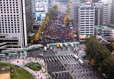 在首爾市政廳附近的這起示威,組織者稱有5萬人參加,最后約有100人遭逮捕,警民雙方共約60多人受傷。美韓歷經(jīng)長久談判,在今年6月簽署自由貿(mào)易協(xié)議、同意降低或撤除商品關(guān)稅和其它貿(mào)易壁壘。