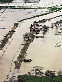 重災區(qū)博葛禮已有逾1萬人死亡,95%屋子被摧毀,19萬人無家可歸。緬甸軍政府指,風速達190公里的“納爾吉斯”卷起3.5米高巨浪,沖走低洼地區(qū)村落半數房屋,大量災民在巨浪中溺斃。美國宇航局衛(wèi)星圖片顯示,緬甸西南部沿海平原完全被水淹沒。聯(lián)合國稱,受災人口約2400萬人,接近全國一半人口。