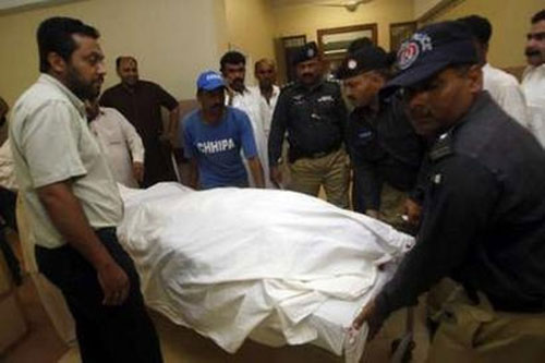 5月23日晚,巴基斯坦穆斯林聯(lián)盟(謝里夫派)副主席塔里克·漢在卡拉奇遭不明身份人員槍擊身亡,圖為警察在轉(zhuǎn)運尸體(國際在線配圖)