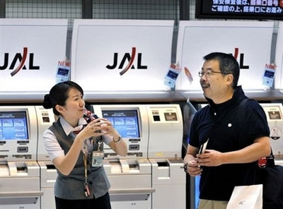 日航機(jī)場共人員為滯留乘客辦理手續(xù)。