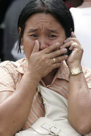 “群星公主”號(hào)渡輪乘客和船員親屬在宿務(wù)等待消息時(shí)對(duì)蘇爾皮西歐船運(yùn)公司的雇員尖叫。一位婦女對(duì)該公司的一名雇員稱:“你無(wú)法讓我們的親人回來(lái),你應(yīng)當(dāng)對(duì)此負(fù)責(zé)!碧K爾皮西歐船運(yùn)公司稱,它將向每位遇難者的家屬支付20萬(wàn)比索(4500美元)的賠償,向幸存者支付一定數(shù)量的金錢。(黃歡)