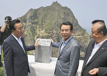 報(bào)道引述韓國“聯(lián)合新聞通訊社”指出,韓國建國六十年來,首次由現(xiàn)任國務(wù)總理韓升洙登訪獨(dú)島后,鼓勵(lì)了海洋警察隊(duì)隊(duì)員和獨(dú)島居民金圣道夫婦,并在現(xiàn)場設(shè)置一塊長三十二公分、寬二十二公分的標(biāo)石,上面刻有“東海上的韓國領(lǐng)土獨(dú)島”字樣。