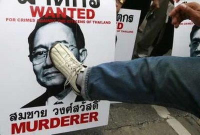 反政府示威者抗議總理頌猜采用強制手段鎮(zhèn)壓民眾。當(dāng)日,示威者封鎖了一條商業(yè)街道,并四處散發(fā)記錄7日警民對峙的碟片及照片,還有人高舉稱警察總長和頌猜為“殺手”的標(biāo)語。