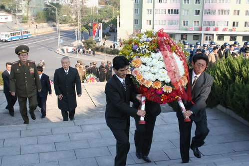 中國(guó)駐朝鮮大使劉曉明和使館館員,以及正在訪朝的中國(guó)大型現(xiàn)代舞劇《紅梅贊》藝術(shù)團(tuán)參加了儀式,并分別以中國(guó)駐朝鮮大使館和藝術(shù)團(tuán)的名義向友誼塔敬獻(xiàn)花圈;ㄈ剮蠈(xiě)著“中國(guó)人民志愿軍烈士永垂不朽”。