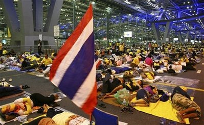 據(jù)悉,約2000名示威者闖入新國際機場客運大樓的離境大堂,泰國機場公司宣布在當?shù)貢r間25日晚上9時起暫時關閉機場,準備在機場降落的航機要轉飛清邁、布吉和其它地區(qū)的機場,數(shù)以千計旅客滯留。