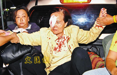 被炸傷的一名黃衣示威者眼部血流不止,在其它人協(xié)助下撤離現(xiàn)場(chǎng)