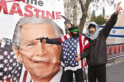此外,巴勒斯坦強(qiáng)硬派發(fā)起反布什示威,跟巴勒斯坦溫和派歡迎布什到訪,形成鮮明對(duì)比。布什即將抵達(dá)前,加沙地帶的巴人武裝分子向以色列南部發(fā)射火箭炮,擊中一間房屋,當(dāng)?shù)赜袛?shù)名哈馬斯支持者示威。