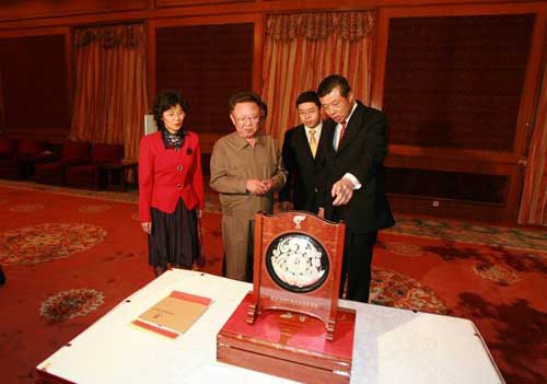 劉大使向金正日總書記贈(zèng)送北京奧運(yùn)紀(jì)念銀盤(圖片來(lái)源:外交部網(wǎng)站)