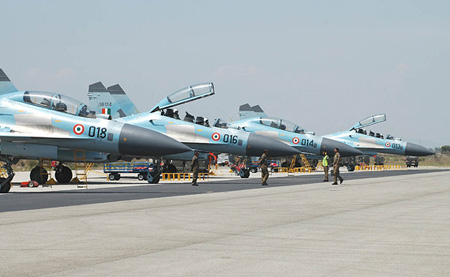 印度空軍蘇-30MK戰(zhàn)機群整齊停放在高原機場上(資料圖)