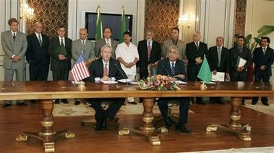 負責(zé)中東外交事務(wù)的美國助理國務(wù)卿韋爾奇與利比亞外交部美洲事務(wù)負責(zé)人費圖里,分別代表兩國政府在協(xié)議上簽字。韋爾奇表示,這是為兩國關(guān)系開啟新一頁的協(xié)議;費圖里說,這是經(jīng)過漫長而且筋疲力竭的談判后的成果。