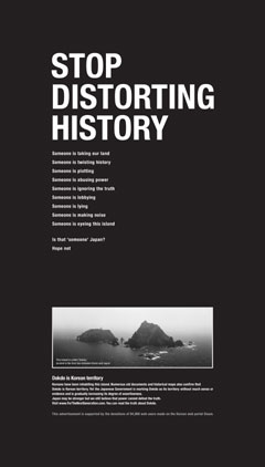 網(wǎng)民們還選定了廣告內容。Daum從4日至12日,在網(wǎng)站公布了某廣告公司免費制作的三個廣告試案,并征求眾網(wǎng)民意見。結果,58.6%的網(wǎng)民選擇了“STOP DISTORTING HISTORY(停止歪曲歷史)”這一廣告文案。