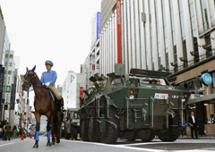 在中央?yún)^(qū)的銀座地區(qū),道路被封鎖,警察和消防隊(duì)員使用繩索和云梯車(chē)從百貨店等大樓內(nèi)營(yíng)救“受困者”。自衛(wèi)隊(duì)員駕駛裝甲車(chē)和救護(hù)車(chē)從地鐵站內(nèi)救出旅客并轉(zhuǎn)移到安全場(chǎng)所。警視廳的騎警隊(duì)也參加了演習(xí)。