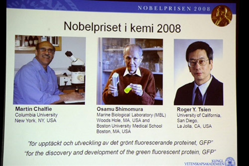 中新網(wǎng)10月8日電 綜合報(bào)道,瑞典皇家科學(xué)院諾貝爾獎(jiǎng)委員會(huì)于當(dāng)?shù)貢r(shí)間10月8日11時(shí)45分左右(北京時(shí)間10月8日17時(shí)45分左右)宣布,將2008年度諾貝爾化學(xué)獎(jiǎng)授予美國(guó)日裔科學(xué)家下村修(Osamu Shimomura)、美國(guó)科學(xué)家馬丁·查爾菲(Martin Chalfie),以及美國(guó)華裔科學(xué)家錢(qián)永健。他們?nèi)嗽诎l(fā)現(xiàn)和研究綠色熒光蛋白(GFP)方面有突出成就。