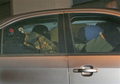 魯比納被蒙上迷彩頭套,蒙面特警坐其兩旁(車廂后排)