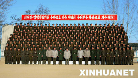 資料圖片:在這張朝鮮中央通訊社12月19日公布的照片中,朝鮮最高領(lǐng)導(dǎo)人金正日與人民軍955部隊(duì)指戰(zhàn)員合影。據(jù)朝鮮中央通訊社19日?qǐng)?bào)道,金正日于近日視察了朝鮮人民軍955部隊(duì)司令部。新華社/朝中社