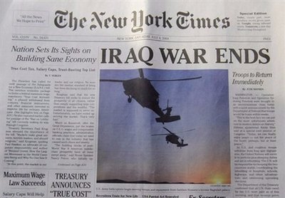 《紐約時(shí)報(bào)》發(fā)言人12日表示,所有刊登上述“伊拉克戰(zhàn)爭結(jié)束”新聞的仿“紐約時(shí)報(bào)”都是有人惡搞的“山寨版本”。據(jù)悉,有關(guān)方面正在對此展開調(diào)查。來自網(wǎng)站(本次惡作劇的發(fā)起單位)的消息稱,策劃這張假紐約時(shí)報(bào)耗費(fèi)了半年多時(shí)間。報(bào)紙最終在六個(gè)印刷廠開印,并且由志愿者發(fā)放給民眾閱讀。