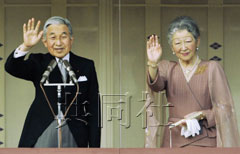 圖為日本天皇、皇后正在向前來(lái)祝賀的人們揮手致意。