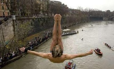 據(jù)臺(tái)灣“東森新聞”報(bào)道,當(dāng)你看到綽號(hào)“泰山”的男子,又出現(xiàn)在意大利臺(tái)伯河上方時(shí),你就知道新的一年又來了!他將從大橋上一躍而下,高度總共有17米,救難人員已經(jīng)在一旁待命;當(dāng)他優(yōu)雅地跳到臺(tái)伯河中,救難人員立刻開救生艇過去拉他一把。
