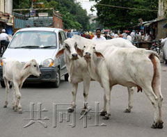 印度路上的牛很多是以前被飼養(yǎng)因產(chǎn)不出牛奶或變老而被拋棄,或是因放養(yǎng)而闖到路上的。在印度禁止食用作為神靈的“!比。就沒有人想要抓那些迷路的牛。即使那些牛在道路中間成為交通的障礙,在路上逆行,市民們也都會(huì)避開。