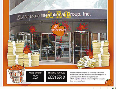 中新網(wǎng)3月25日電 據(jù)香港《明報(bào)》25日援引外電報(bào)道,美國(guó)AIG花紅風(fēng)暴,令民眾氣憤難平,自由派網(wǎng)站日前在網(wǎng)上開(kāi)設(shè)“擲西紅柿”泄憤游戲。網(wǎng)民們可邊詛咒、邊瞄準(zhǔn)AIG大樓入口圖片狂擲虛擬西紅柿。