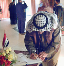 一名支持者在薩達(dá)姆故鄉(xiāng)奧賈村的墓地設(shè)施內(nèi)留言。攝于21日。(共同社)