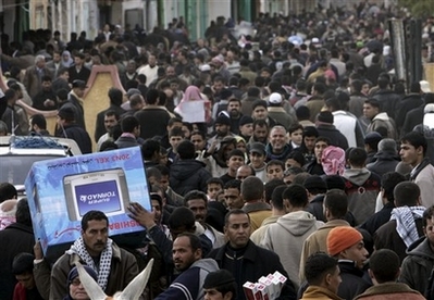 據(jù)“中央社”報道,埃及邊境衛(wèi)隊并未采取行動。埃及總統(tǒng)穆巴拉克說,他告訴邊界官員,“讓他們(加沙人)進來,找東西吃或是購買食物,只要他們沒帶武器,就讓他們回去”。興高采烈的加沙人民涌向埃及邊界的拉法鎮(zhèn),購買香煙、燃料,以及其它因為當?shù)剡B月遭到封鎖而變得稀有的物品。