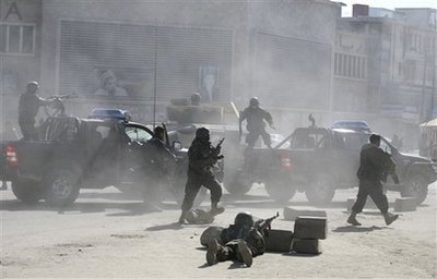 另據(jù)新華網(wǎng)報道,有目擊者稱,恐怖分子一度占領(lǐng)了司法部大樓,并用自動步槍瘋狂掃射。目前,警方已奪回對大樓的控制權(quán),并打死至少4名恐怖分子。此外,在阿富汗安全情報部附近,安全人員也打死2名準備發(fā)動自殺襲擊的恐怖分子?植婪肿赢斕爝向位于喀布爾北部的一座政府建筑發(fā)動了襲擊。