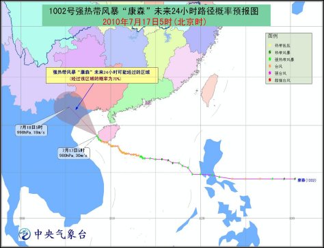 今年第2號(hào)臺(tái)風(fēng)“康森”的中心已于16日19時(shí)50分在海南省三亞市沿海登陸,登陸時(shí)中心附近最大風(fēng)力有12級(jí)(35米/秒),中心最低氣壓為968百帕。17日凌晨2時(shí)“康森”在海南樂(lè)東近海減弱為強(qiáng)熱帶風(fēng)暴,4時(shí)前后進(jìn)入北部灣海面,5時(shí)其中心位于北緯18.9度、東經(jīng)108.5度的海面上,中心附近最大風(fēng)力有11級(jí)(30米/秒),中心最低氣壓為980百帕。