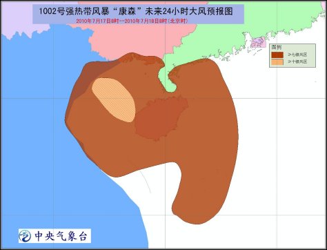 受其影響,17日白天到夜間,南海西北部、瓊州海峽、海南省及其沿海、廣東西部沿海、廣西沿海、北部灣將有7~9級(jí)大風(fēng),“康森”中心經(jīng)過(guò)的附近海面的風(fēng)力可達(dá)10~12級(jí),北部灣部分海域陣風(fēng)可達(dá)13~14級(jí);廣東西南部、廣西南部、海南、云南東南部將有大到暴雨,其中海南西部、廣西南部的部分地區(qū)有大暴雨。