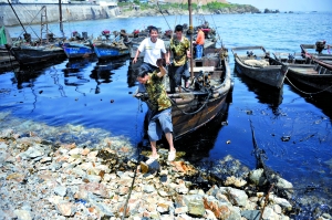 昨日,在大連港事故現(xiàn)場的海面上,十多艘海事清污船正在作業(yè)。當(dāng)天的清污工作主要由海事部門組織,大連軍分區(qū)派出1100名官兵、200名民兵參與清理。