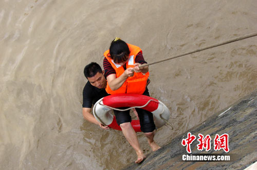 消防官兵搜尋到中攤堡大道,聽到中普建設(shè)楓香樹村安置房與中攤堡安置房交界處傳來(lái)求救聲音,利用強(qiáng)光手電筒發(fā)現(xiàn):洪水已將4名來(lái)不及疏散的施工人員團(tuán)團(tuán)包圍,工人在樓頂揮手、呼喊求救!安灰保覀凂R上想辦法過(guò)來(lái)救你們”。由于水流很急且到處都是施工隊(duì)挖的暗溝,時(shí)間緊迫,消防站余柯政站長(zhǎng)來(lái)不及多考慮,立即下令,將保險(xiǎn)繩拴在消防車上,余站長(zhǎng)和劉飛穿上救生衣,綁好安全繩后,帶著救生圈慢慢的游到被困群眾位置,將救生衣為民工穿好后,一邊由消防官兵護(hù)送一邊由在消防車一邊的其余消防官兵牽引安全繩接應(yīng),緊急轉(zhuǎn)移被困群眾。一趟、兩趟、三趟……經(jīng)過(guò)近半小時(shí)的奮戰(zhàn),成功救出被困工人。