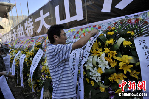 向著泥石流沖下的方向,掛著特大的標(biāo)語“沉痛哀悼舟曲特大山洪泥石流遇難同胞”,在泥石流沖擊兩側(cè)的殘?jiān)珨啾谏弦矑熘鴶?shù)條哀悼的條幅,花籃和花圈都已經(jīng)安放好。當(dāng)?shù)厝罕姟⒕仍藛T、志愿者在現(xiàn)場(chǎng)等待著儀式開始,人們胸前都佩戴著白花。