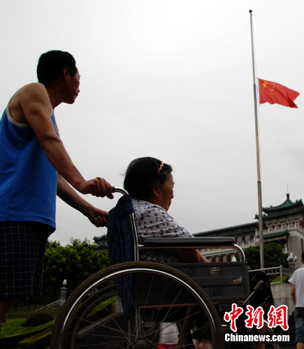 中新網(wǎng)重慶8月15日電 (郭晉嘉 連肖) 15日,重慶天氣陰沉,國(guó)旗低懸,所有網(wǎng)站、報(bào)紙頭版均換成黑白色,娛樂場(chǎng)所打出停業(yè)一天的告知,不少市民自發(fā)前往廣場(chǎng)等地在國(guó)旗下哀悼甘肅舟曲泥石流災(zāi)害遇難同胞。