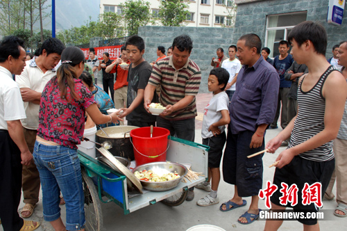 中新網(wǎng)汶川8月16日電(任露 張浪 鄢銀嬋)8.14汶川泥石流災(zāi)害,造成大量旅客滯留在國道213線,8月16日中午12點左右,在銀杏小學(xué)門口,銀杏鄉(xiāng)一位穿紅色衣服婦女帶著一家六口,推著裝有飯菜湯的三輪車給滯留人員送飯。