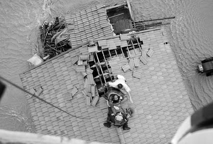 經(jīng)過(guò)近兩個(gè)小時(shí)的飛行,B~7312救助直升機(jī)到達(dá)丹東機(jī)場(chǎng)中轉(zhuǎn)加油。此時(shí)傳來(lái)的消息是:洪水已經(jīng)漲至齊腰深,4名群眾被困“孤島”。由于當(dāng)?shù)靥鞖馔蝗蛔儔,潘偉?duì)長(zhǎng)、副駕駛李春雨數(shù)次嘗試?yán)@開(kāi)雷雨區(qū),均未成功。直升機(jī)隨即返航。