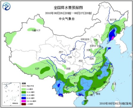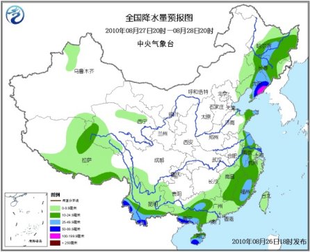 26日20時至27日20時,新疆天山局部地區(qū)和南疆西部、青海南部、西藏南部和中東部、內蒙古東南部、東北中南部、華北東部和南部、黃淮大部、江淮大部、江漢南部、江南、華南大部、西南大部等地有小到中雨或陣雨,其中,吉林南部、遼寧中東部、山東半島東部、江蘇東部和南部、安徽南部、浙江西部、江西東北部以及湖南南部、貴州東部廣西中東部、海南西部、云南中西部等地有大到暴雨,遼寧東部的局部地區(qū)有大暴雨;上述部分地區(qū)并伴有短時雷雨大風等強對流天氣。新疆北部、內蒙古東部、東北有4~6級風。南疆盆地的部分地區(qū)有揚沙或浮塵天氣。黃海北部和中部海域將有6~7級、陣風8級的旋轉風;南海中部海域將有5~6級、陣風7級的旋轉風。