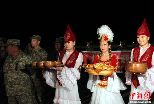 在奧塔爾市火車站站臺上舉行的簡樸而隆重的歡迎儀式上,用中、俄兩種文字書寫的“熱烈歡迎‘和平使命-2010’聯(lián)合反恐軍事演習(xí)中方參演部隊”的橫幅格外醒目,哈方軍樂隊高奏中、哈兩國國歌,3位哈薩克斯坦盛裝少女手捧當(dāng)?shù)靥厣拿谰、美食,獻給風(fēng)塵仆仆的中方參演官兵。隨后,站臺另一側(cè),中方參演部隊列車第一車隊攜行裝備,也在緊張有序地進行卸載。