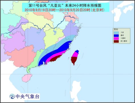 受其影響,未來24小時,東海南部、臺灣以東洋面、臺灣海峽、巴士海峽、巴林塘海峽、南海東北部、浙江南部沿海、臺灣及其沿海、福建沿海、廣東中東部沿海將有7-9級大風,其中福建中南部沿海、廣東東部沿海、臺灣海峽的部分海面或地區(qū)風力可達10-11級,“凡亞比”中心經(jīng)過的附近海面或地區(qū)的風力有12-13級;福建大部、浙江南部、江西東南部、廣東中東部、臺灣等地將有大到暴雨,其中福建東南部、廣東東部、臺灣等地的部分地區(qū)有大暴雨,局地有特大暴雨。中央氣象臺已于今日18時發(fā)布了暴雨藍色預(yù)警。