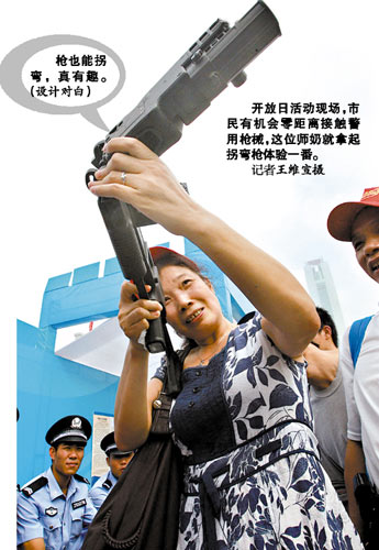 活動(dòng)吸引了許多男女老少慕名前來觀看,男孩子對(duì)各種各樣的新式武器特別感興趣,都想親自摸一摸試一試,女孩子則對(duì)扮相很酷的男特警、女特警很癡迷,紛紛掏出相機(jī)和手機(jī)拍照。