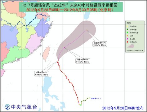 另外,今年第17號(hào)超強(qiáng)臺(tái)風(fēng)“杰拉華”的中心28日05時(shí)位于中國(guó)臺(tái)灣省花蓮市東南方大約310公里的西北太平洋洋面上,中心附近最大風(fēng)力16級(jí)(52米/秒),中心最低氣壓為930百帕。預(yù)計(jì),“杰拉華”將以每小時(shí)15公里左右的速度向偏北轉(zhuǎn)東北方向移動(dòng),逐漸向日本南部一帶沿?拷,強(qiáng)度緩慢減弱。