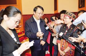 11月27日上午,全國(guó)人大常委會(huì)副秘書長(zhǎng)沈春耀在?谛v十八屆三中全會(huì)精神。圖為他和五指山市黎族干部交流如何貫徹十八屆三中全會(huì)精神提高農(nóng)民收入。本報(bào)記者 王凱 攝
