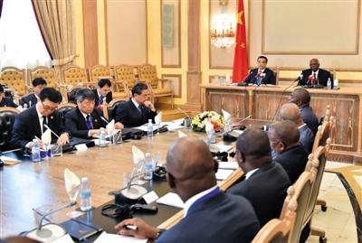 5月9日,國務(wù)院總理李克強在安哥拉總統(tǒng)府同安總統(tǒng)多斯桑托斯舉行會談,外交部部長王毅、國家發(fā)改委主任徐紹史、商務(wù)部部長高虎城等參加。新華社發(fā)