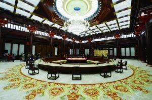 這次APEC期間,領(lǐng)導(dǎo)人圓桌會(huì)議是在雁棲湖國際會(huì)議中心集賢廳內(nèi)召開的。昨日,記者首次走入這個(gè)1200平方米的會(huì)議廳。負(fù)責(zé)集賢廳室內(nèi)設(shè)計(jì)的清華大學(xué)美術(shù)系教師馬怡西介紹說,整個(gè)廳高12米,主要采用木質(zhì)材料,最大亮點(diǎn)是木制裝修與景泰藍(lán)技藝的結(jié)合。