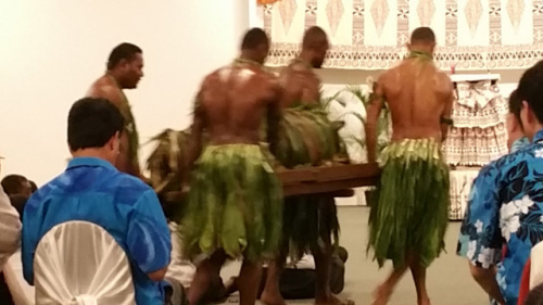 一名斐濟(jì)原住民將草席獻(xiàn)至習(xí)大大面前,另一人手持鯨魚(yú)牙向習(xí)大大致祝福語(yǔ)并獻(xiàn)上鯨魚(yú)牙。咦,不是剛剛獻(xiàn)過(guò)一次嗎?不管那么多了,接過(guò)鯨魚(yú)牙再次轉(zhuǎn)交給斐濟(jì)禮賓官,禮賓官向獻(xiàn)禮人拍掌并表示感謝。之后,斐濟(jì)原住民將草席撤下。