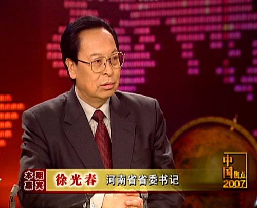 好,接下來我們繼續(xù)來關(guān)注新農(nóng)村建設(shè)的話題。今天在演播室我們非常容幸地邀請到中共河南省委書記徐光春先生。您好,徐書記。