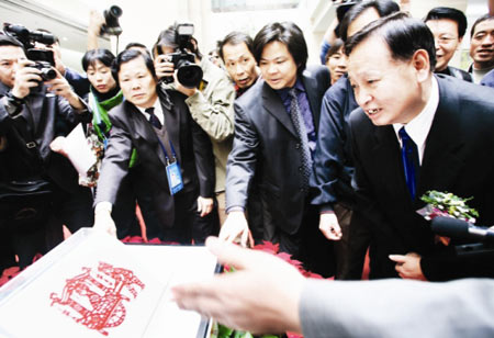 昨日上午11時,《國風(fēng)歸來——第二屆全國剪紙藝術(shù)展》在省藝術(shù)館開幕,胡錦濤總書記剪紙作品《回娘家》正式與觀眾見面。省委書記、省長羅清泉,省委常委、宣傳部部長張昌爾,副省長李春明,省政協(xié)副主席王少階,省政府秘書長段輪一等出席了開幕式,來自全國各地的上千名觀眾如潮水般涌入藝術(shù)館參觀。